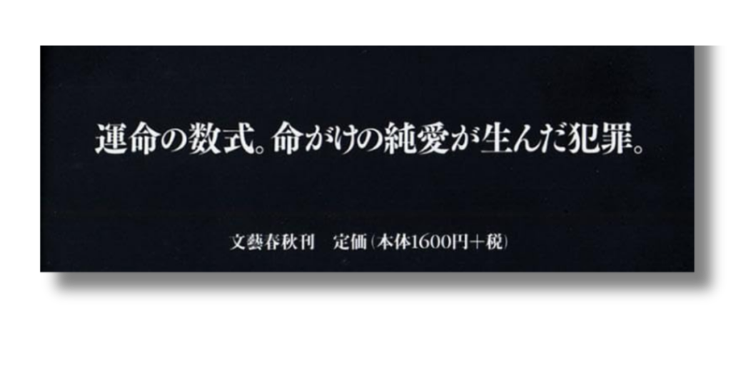 「運命の数式」という言葉は、石神が構築したアリバイが、あたかも数学の定理のように一分の隙もないことを示唆しています。一方で「命がけの純愛」という言葉が、その冷徹な計算の動機がこの上なく人間的であることを告げます。この「冷たさ」と「熱さ」のギャップこそが、読者の好奇心を最大化させ、「これは単なる犯人捜しではない」という直感を与えている名デザインです。