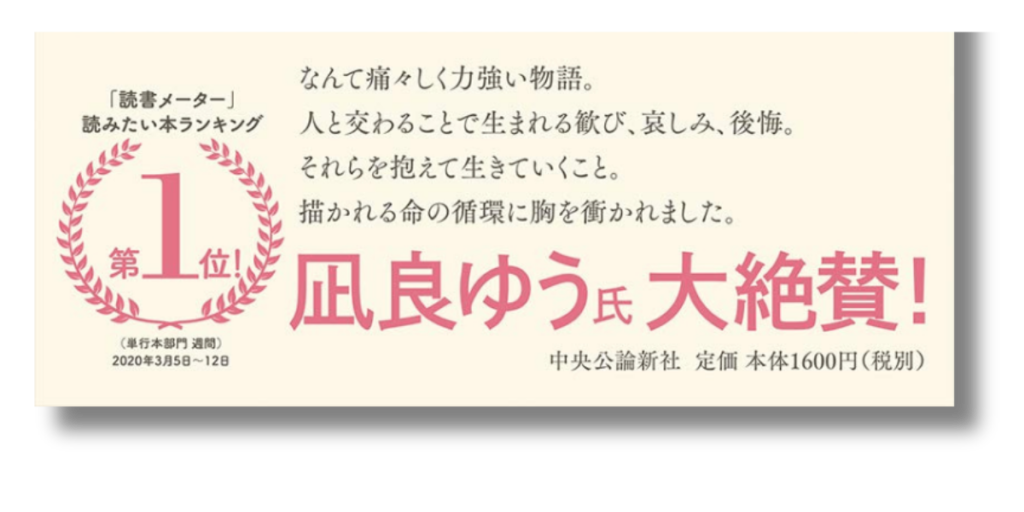 この物語を読んだ誰もが抱く、「辛すぎて正視できない(痛々しい)」という感情と、「それでも生きていこうとする姿に圧倒される(力強い)」という感動。その矛盾する心の揺れを、たった一文で肯定してくれています。 また、最後に「!」(感嘆符)をつけないことで、大声で叫ぶ宣伝文句ではなく、読んだ人の心の底から漏れ出た「独り言」のようなリアリティを持たせている点も、作品のトーンに完璧に合致しています。