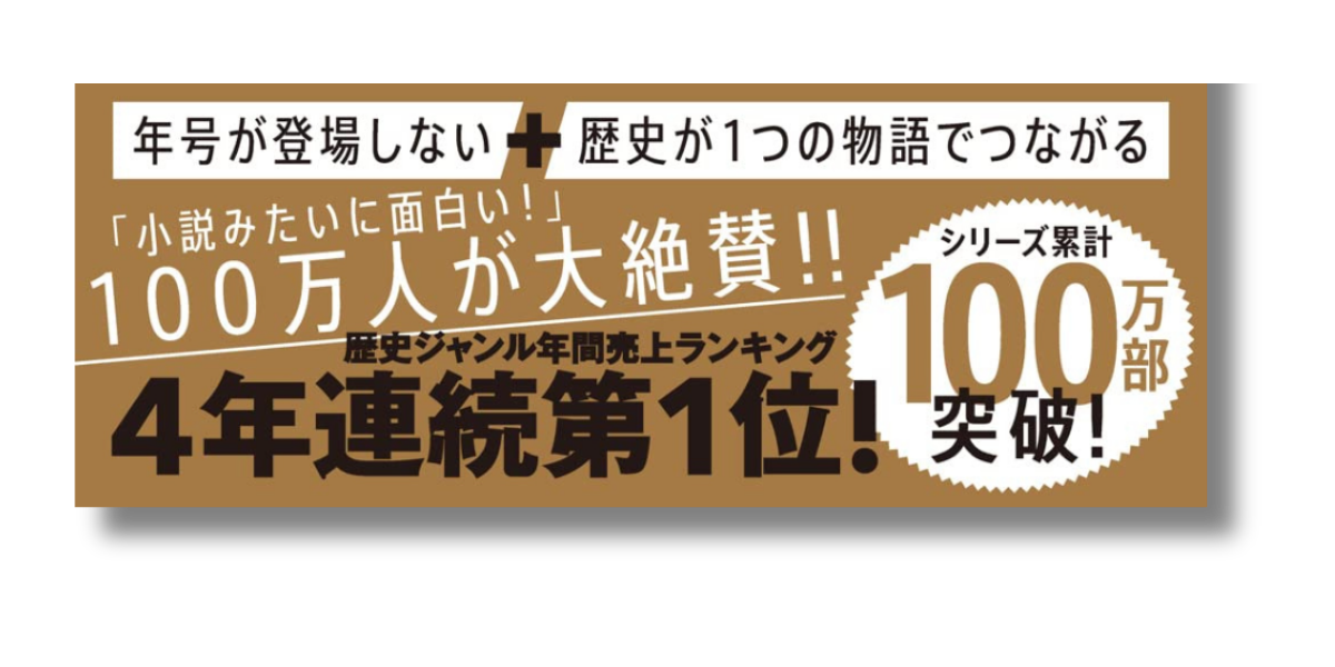 この帯の凄さは、学習者が抱える最大のストレス(年号暗記)を「排除する」と宣言することで、強烈なメリットを提示している点にあります。あえて年号を載せないという「非常識」をフックにしつつ、「一つの物語」という言葉で知的好奇心を刺激する。この「マイナス(年号なし)」と「プラス(物語化)」の組み合わせが、読み手に「これなら挫折せずに読める!」という圧倒的な安心感と期待感を与えています。