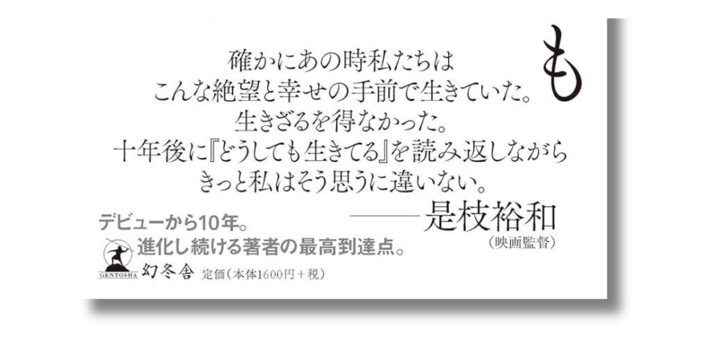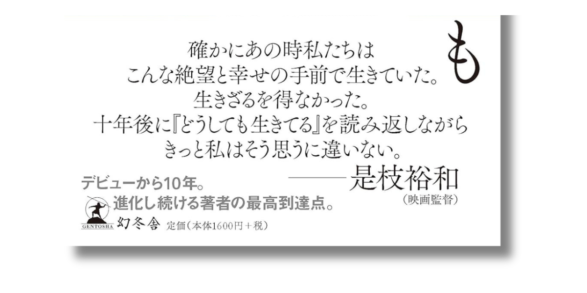「絶望」でも「幸せ」でもない、その「手前」にある言語化しにくい感情。それを「生きざるを得なかった」という強い言葉で肯定しています。また、「十年後に読み返しながら~」という一文を添えることで、今感じている辛さや停滞も、いつか振り返った時には「愛おしい記憶」に変わるかもしれないという、静かな希望を提示しています。本を単なる娯楽ではなく、人生の伴走者のように感じさせる、極めて情緒的なコピーです。